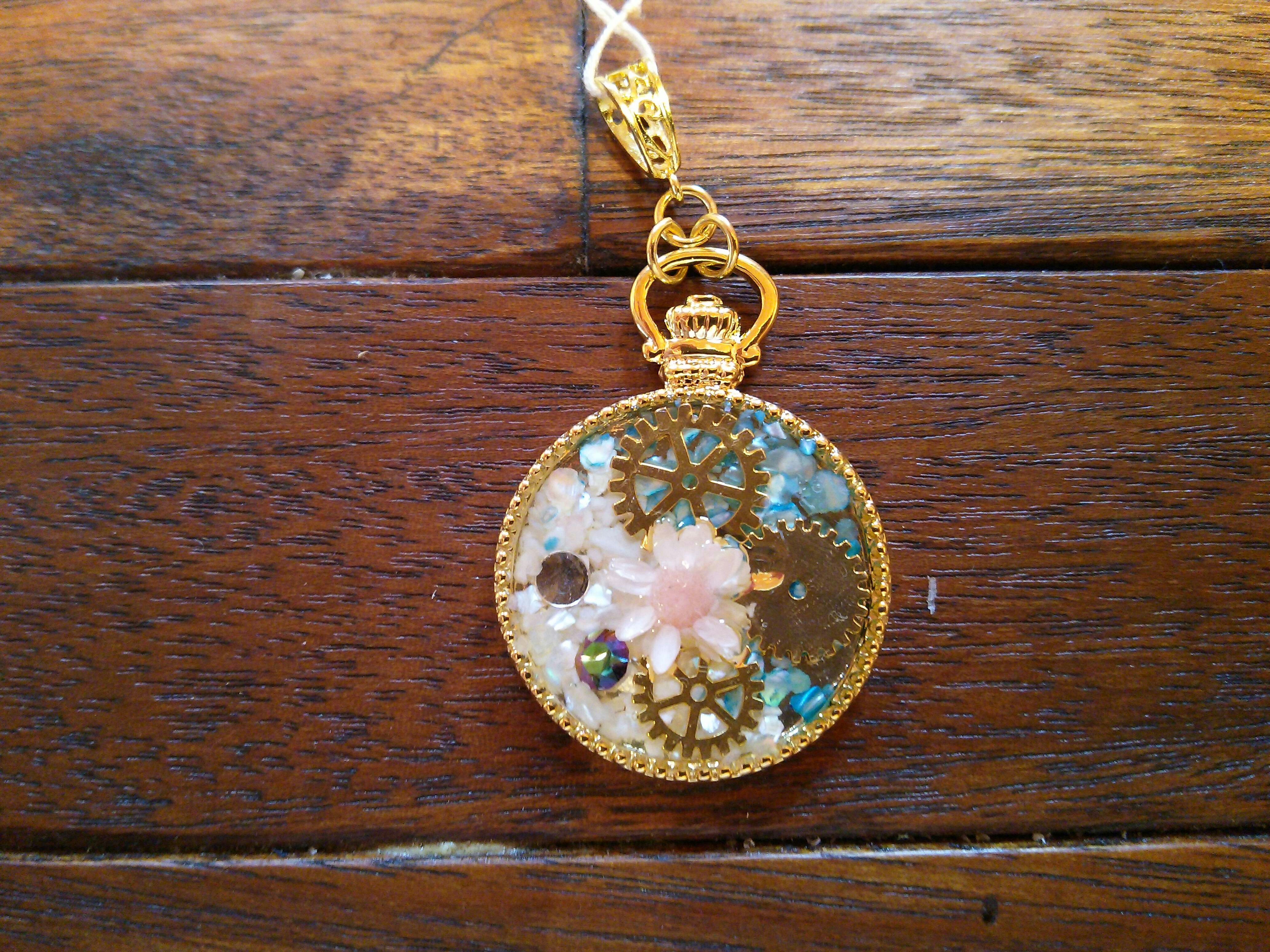 13 June 時計のペンダントトップ ペンダントトップとして作りましたが、バックチャームにもできます。 チェーンの部分はつけてありません。 革紐をつけてペンダントにしたり(革紐は別料金)バックチャーム用のパーツをつけて使ったり、用途を選べます。 ペンダントトップのみ1,500円(税込み)reserve
