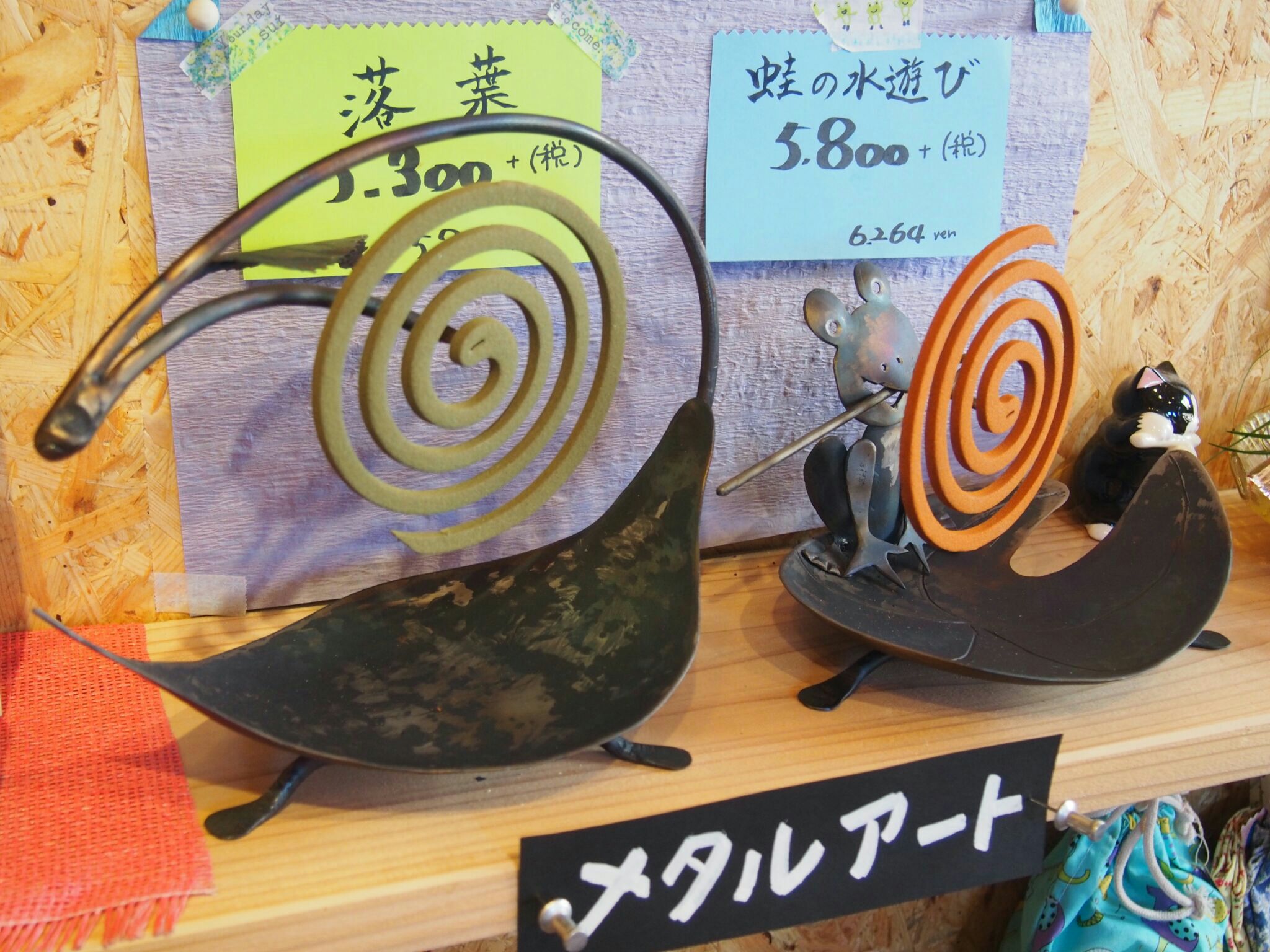 20 July メタルアート蚊取線香立て 職人の手作り蚊取線香立てです。 受注製作となります。 納期は2〜3週間頂きます。 写真向かって左側「落葉」5.300yen+税(5.724yen) 右側「蛙の水遊び」5.800yen+税(6.264yen) オブジェとしても楽しめます。