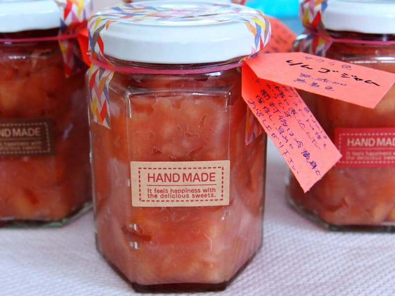 21 November サクラ色のりんごジャム サクラ色のりんごジャム。長野県小諸市の松井農園で収穫されたナガノゴールドと秋映を使用。真っ赤な秋映の皮を一緒に煮込んだためにサクラ色に染まっています。在庫限りです。